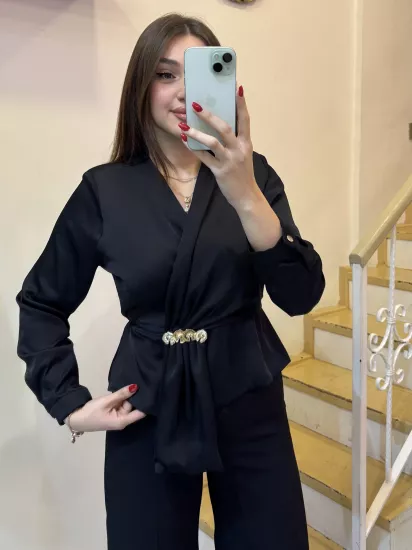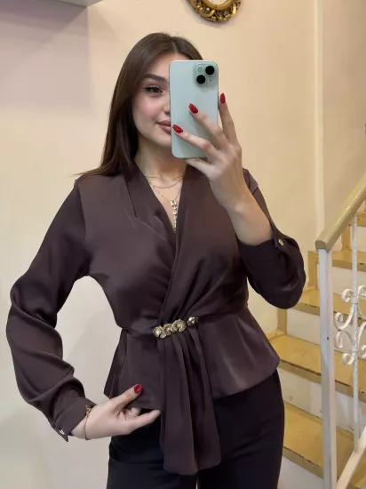 Kruvaze Saten Gold Aksesuarlı Bluz